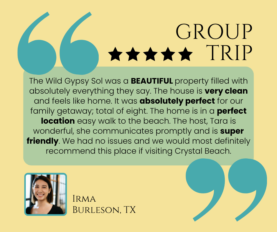 3 Bedrooms • 2 Bathrooms 2 Baths • Sleeps 1-10The Wild Gypsy Sol, presented by Suncation Escapes, is whimsical and wild, standing proud in the salty breeze off the shores of the Gulf of Mexico. Nestled in a well established community in Crystal Beach, Texas, Wild Gypsy Sol envelopes her guests in warmth and beauty, leaving one feeling energized and invigorated. Inside, you'll be greeted by the open concept living space, uniquely decorated in light, earthy tones and modern coastal decor. After a relaxing day at the beach, return to an inviting and spacious outdoor area, whip up a meal on the BBQ grill, or challenge your friends and family to a friendly competition in the game room. Providing hours of fun and entertainment, the colorful sports themed game room is equipped with a ping pong table, foosball, electronic darts, basketball competition, corn hole, TV and so much more, and is sure to be a hit for everyone! A five minute walk is all it takes to get your toes in the powdery sand, where the pounding of the waves mimic a heart beat, and your worries wash away with the tide.